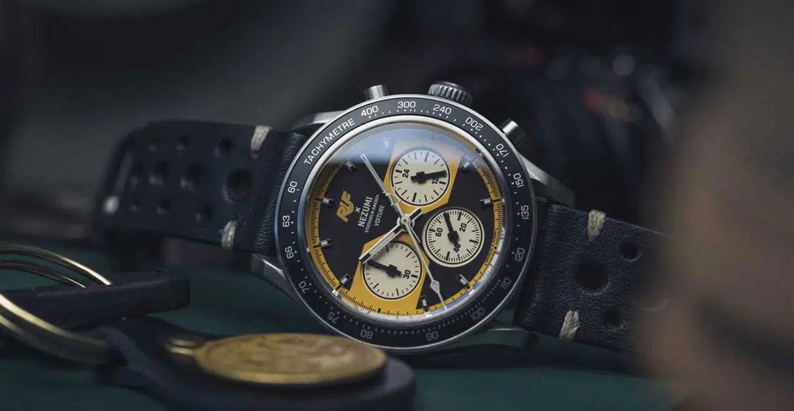 Die NEZUMI x RUF Voiture Chronograph VQ2S.901.2 zitiert mit ihrem markanten gelben Zifferblatt und den motorsportlichen Details die Ikonographie des legendären RUF CTR „Yellowbird“ und übersetzt sie in einen ausdrucksstarken Chronographen mit Charakter.