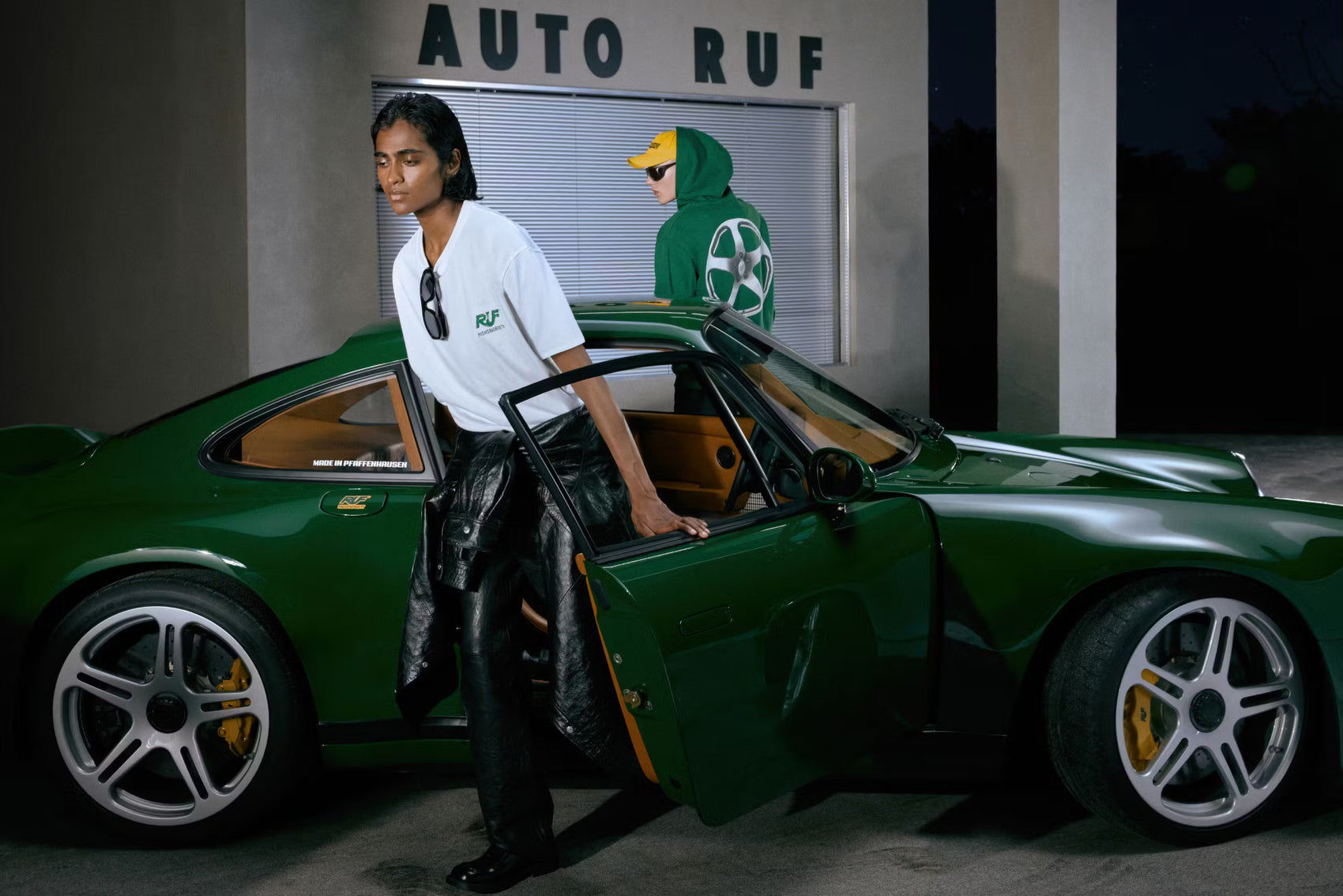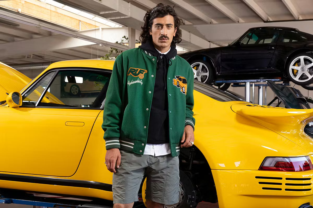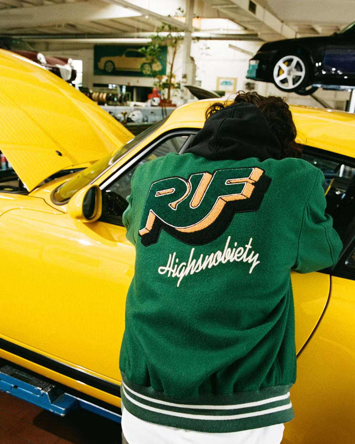 Die neueste Zusammenarbeit von Highsnobiety mit RUF, eine 20-teilige Kollektion von Grafikartikeln, ist geprägt vom Erbe des Familienunternehmens. Unter Verwendung der für RUF typischen Farben Gelb und Grün reicht die Kollektion von einer Lederjacke im College-Stil bis hin zu einer Armbanduhr, die wie eine Felge aussieht.