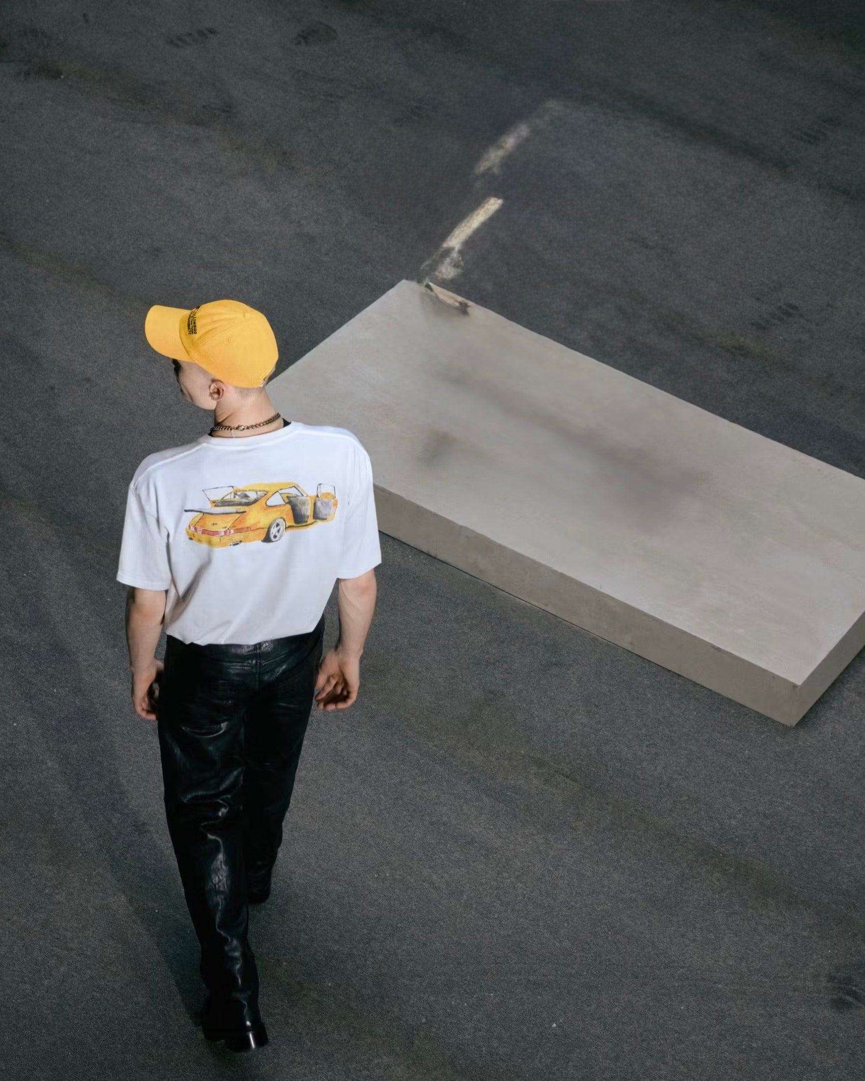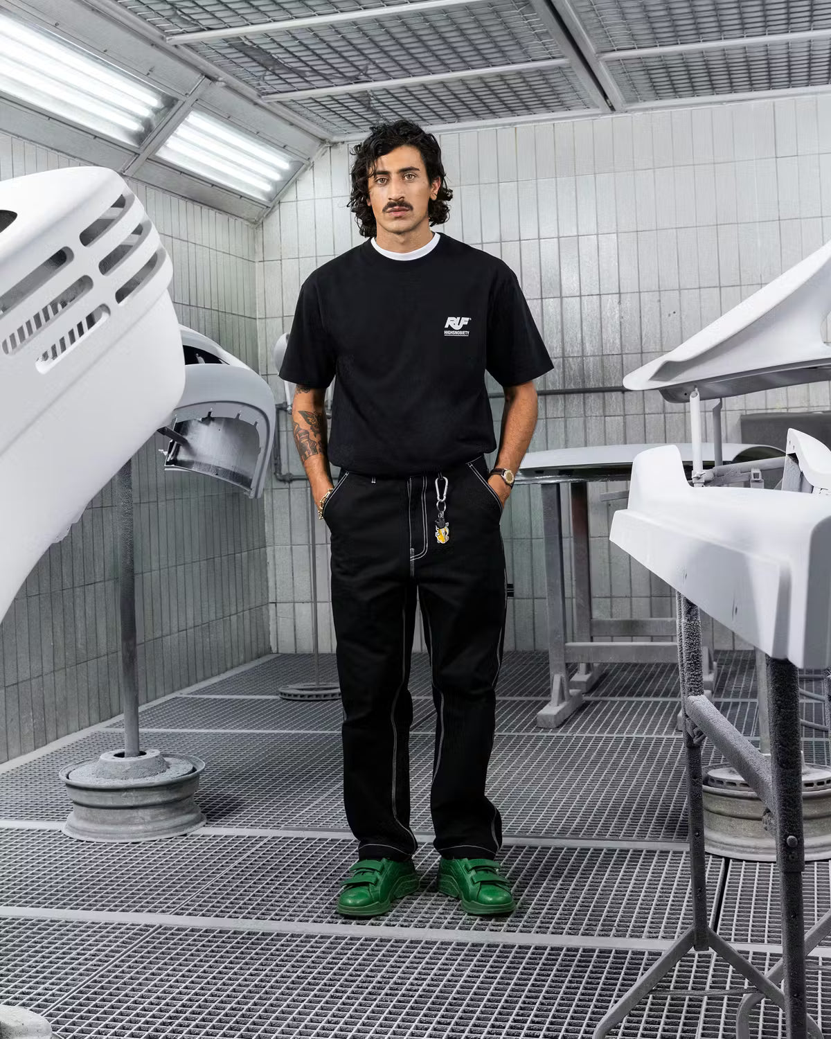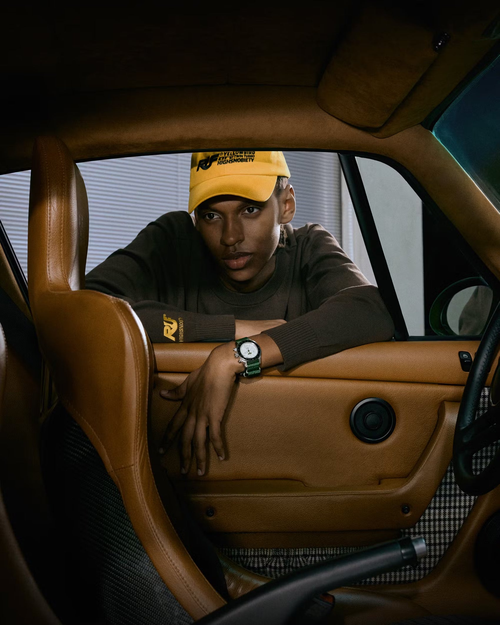 Die neueste Zusammenarbeit von Highsnobiety mit RUF, eine 20-teilige Kollektion von Grafikartikeln, ist geprägt vom Erbe des Familienunternehmens. Unter Verwendung der für RUF typischen Farben Gelb und Grün reicht die Kollektion von einer Lederjacke im College-Stil bis hin zu einer Armbanduhr, die wie eine Felge aussieht.
