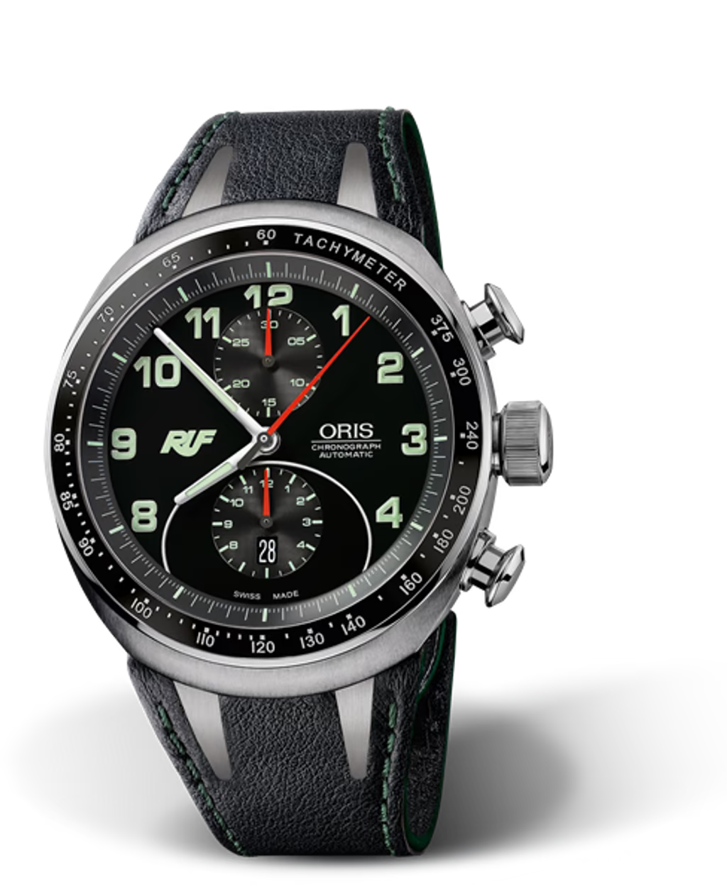 Das 44,5 mm große Titan-Gehäuse mit Keramik-Lünette, schwarzem Zifferblatt, Saphirglas und Sichtboden unterstreicht den technischen Charakter der Uhr, während das automatische Oris Kaliber 673 präzise Chronographenfunktionen und eine Gangreserve von 48 Stunden bietet.