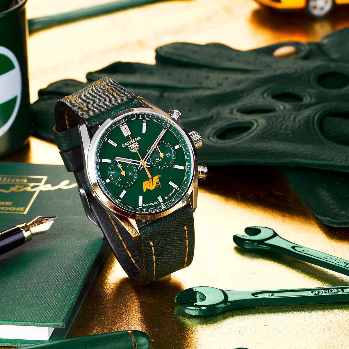 Im Zentrum stehen ein 42-mm-Edelstahlgehäuse, ein von Bamford gestaltetes grünes Zifferblatt mit gelben Akzenten, das hauseigene Heuer-02-Manufakturwerk mit 80 Stunden Gangreserve sowie ein grünes Saffiano-Lederband mit gelber Naht, wodurch die Uhr gleichermaßen technisch, sportlich und stilistisch eigenständig wirkt.
